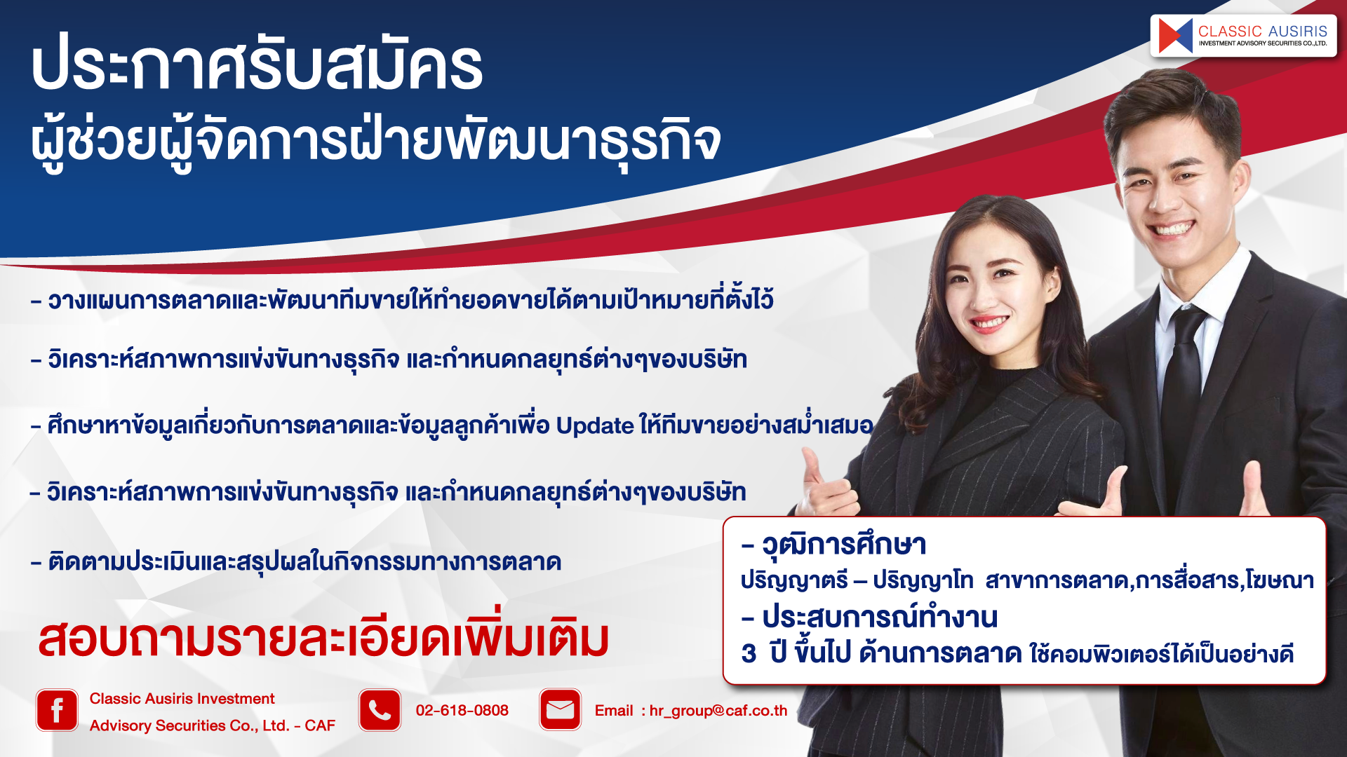 ประกาศรับสมัคร ผู้ช่วยผู้จัดการฝ่ายธุรกิจ